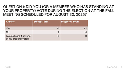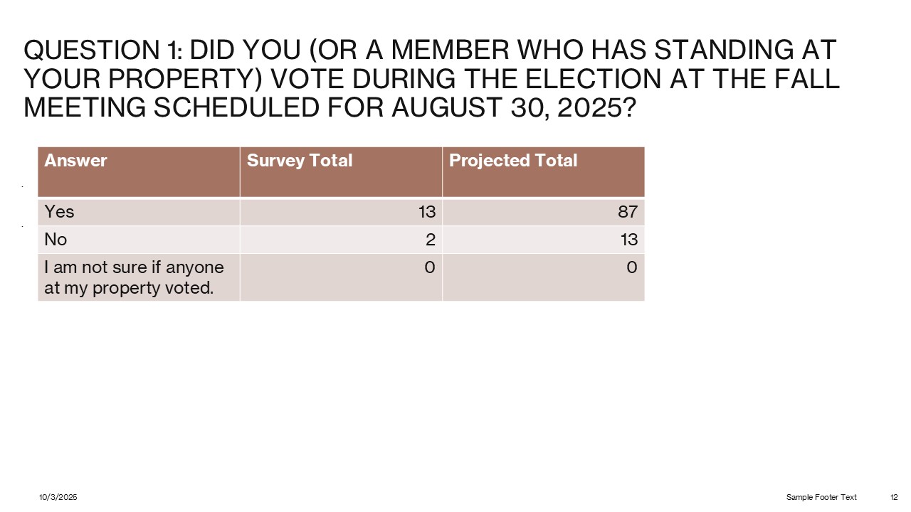 Out of the fifteen respondents to question number 1, Did you vote during the election at the Fall meeting scheduled for August 30, 2025?, thirteen respondents answered, Yes; two answered No.