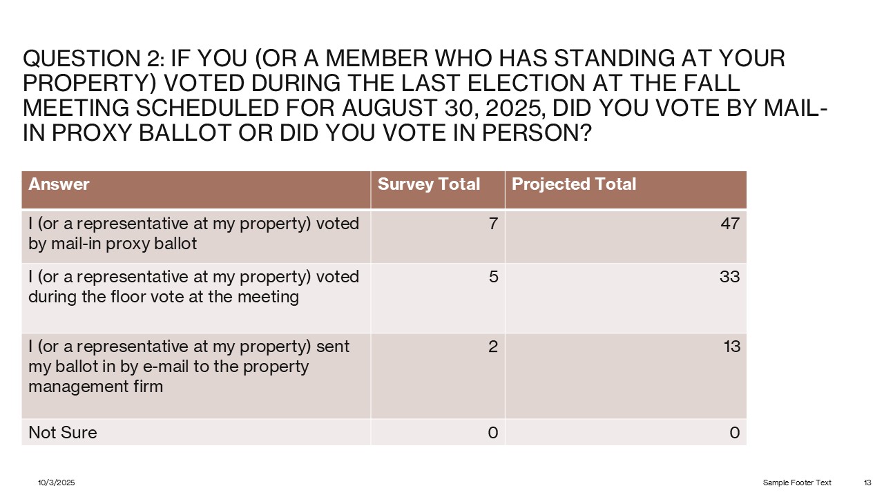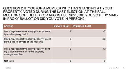 Out of the fourteen respondents to question number 2, If you voted during the last election at the Fall Meeting scheduled for August 30, 2025, did you vote by mail-in proxy ballot or did you vote in person?, seven respondents answered, I voted by mail-in proxy ballot; five answered I voted during the floor vote at the meeting; and two answered I sent my ballot in by e-mail to the property management firm.
