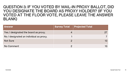 Out of the nine respondents to question number 3, If you voted by mail-in proxy ballot, did you designate the board as proxy holder?, four respondents answered, Yes. I designated the board as proxy.; one answered No. I designated an individual as proxy.; two answered Not Sure; and two answered No Comment.