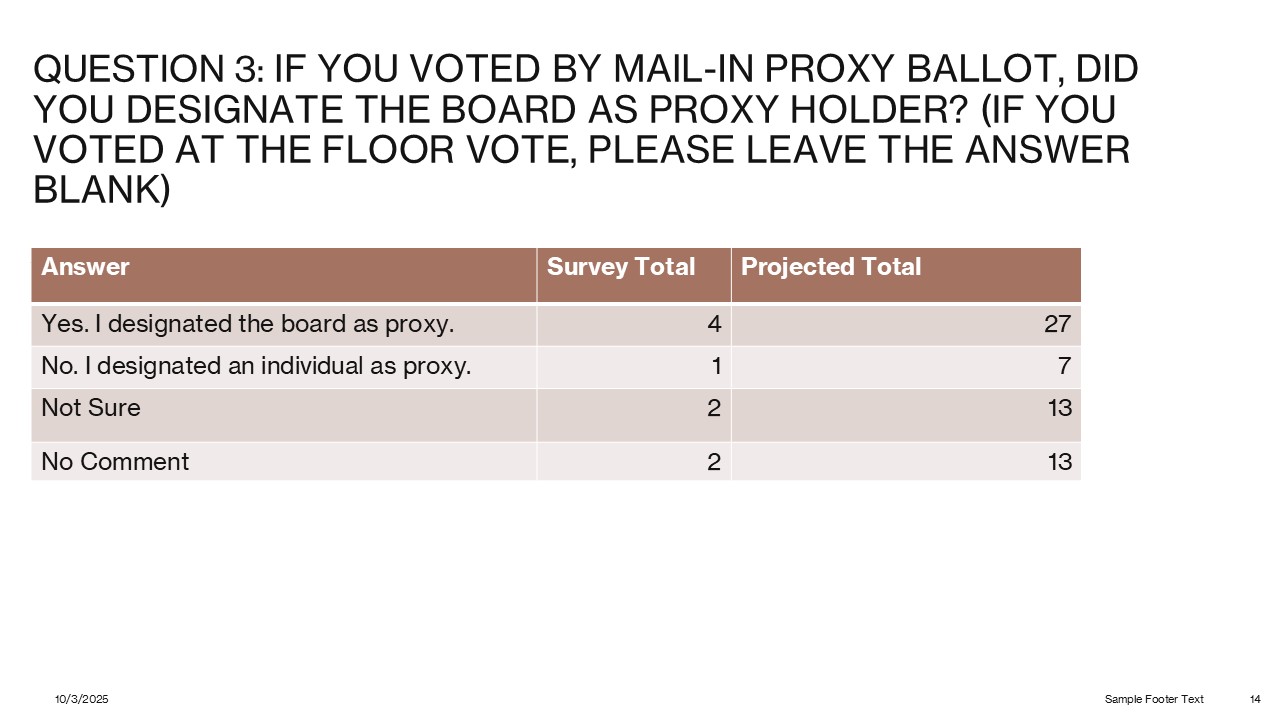 Out of the fourteen respondents to question number 16, Were you aware that if you leave your 2025 ballot blank, having no selections, that the proxy holder is then at liberty to mark any selections on your ballot?, seven respondents (46.6%) answered, Yes. I am aware that if I leave all the selections blank that the proxy holder can overvote the ballot.; five (33.3%) answered No. I was not aware that if leave all the selections blank that the proxy holder has the right to overvote the ballot.; and two (13.3%) answered Not Sure.
