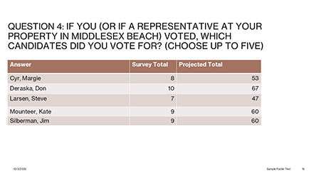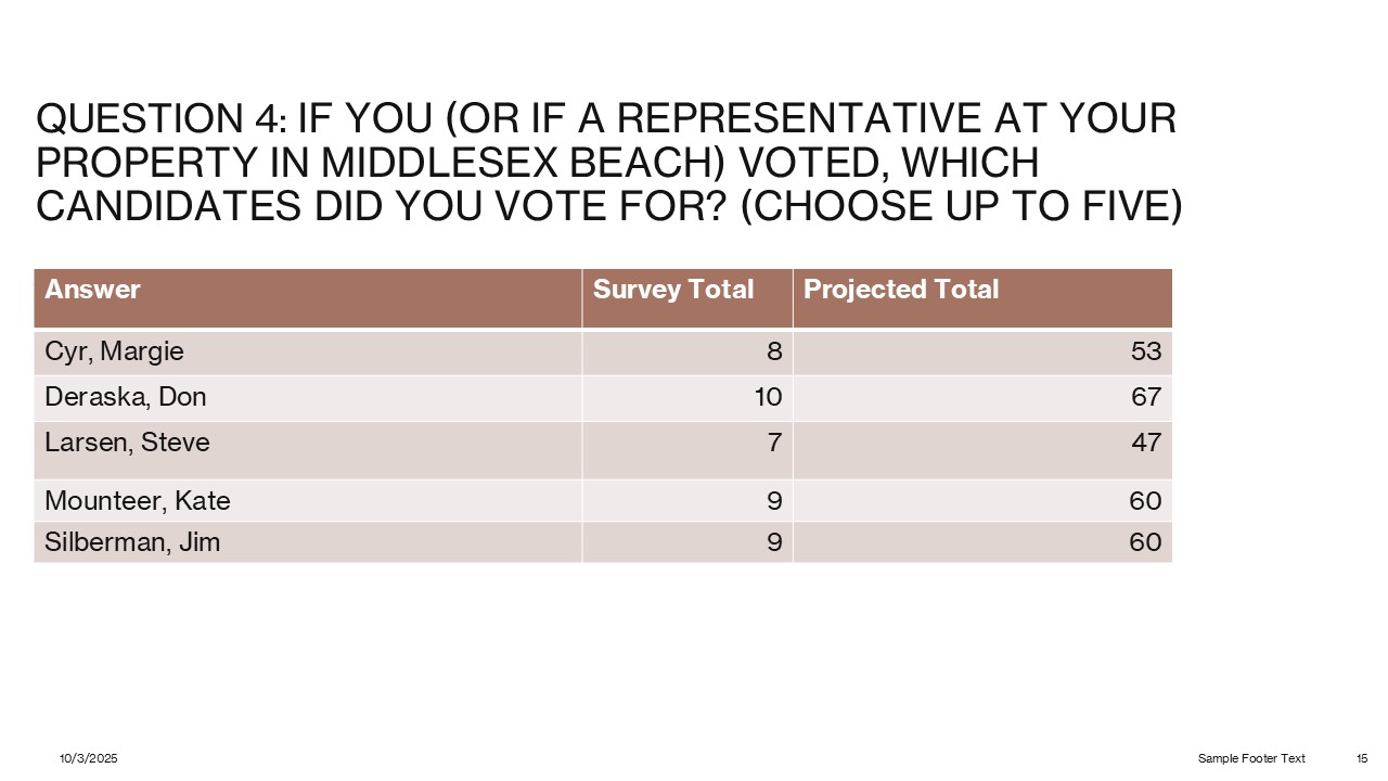 Out of the thirteen respondents to question number 4, If you (or if a representative at your property in Middlesex Beach) voted, which candidates did you vote for? (choose up to five), who reported they voted in the 2025 Election, eight respondents said they voted for Margie Cyr; ten respondents said they voted for Don Deraska; seven respondents said they voted for Steve Larsen; nine respondents said they voted for Kate Mounteer; and nine respondents said they voted for Jim Silberman.