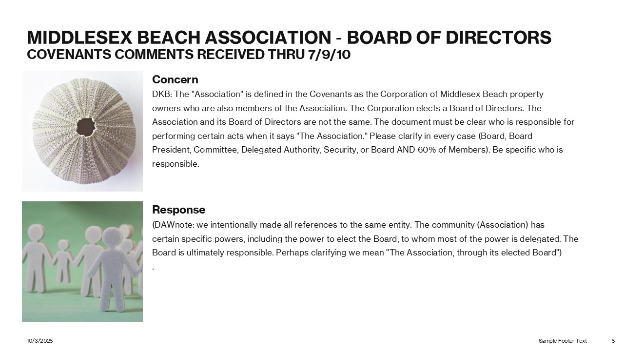 I did not discover any evidence that a change to the authority as to who is responsible for revisions to the bylaws occurred under David Wiecking's watch. In 2009 just as in 2025 the board voted to revise the bylaws, not the membership. However, I did discover a number of documents in the archive pertaining to community discussions in 2010, leading to the change to the restrictive covenants in 2015. I found one of the discussion points very telling.